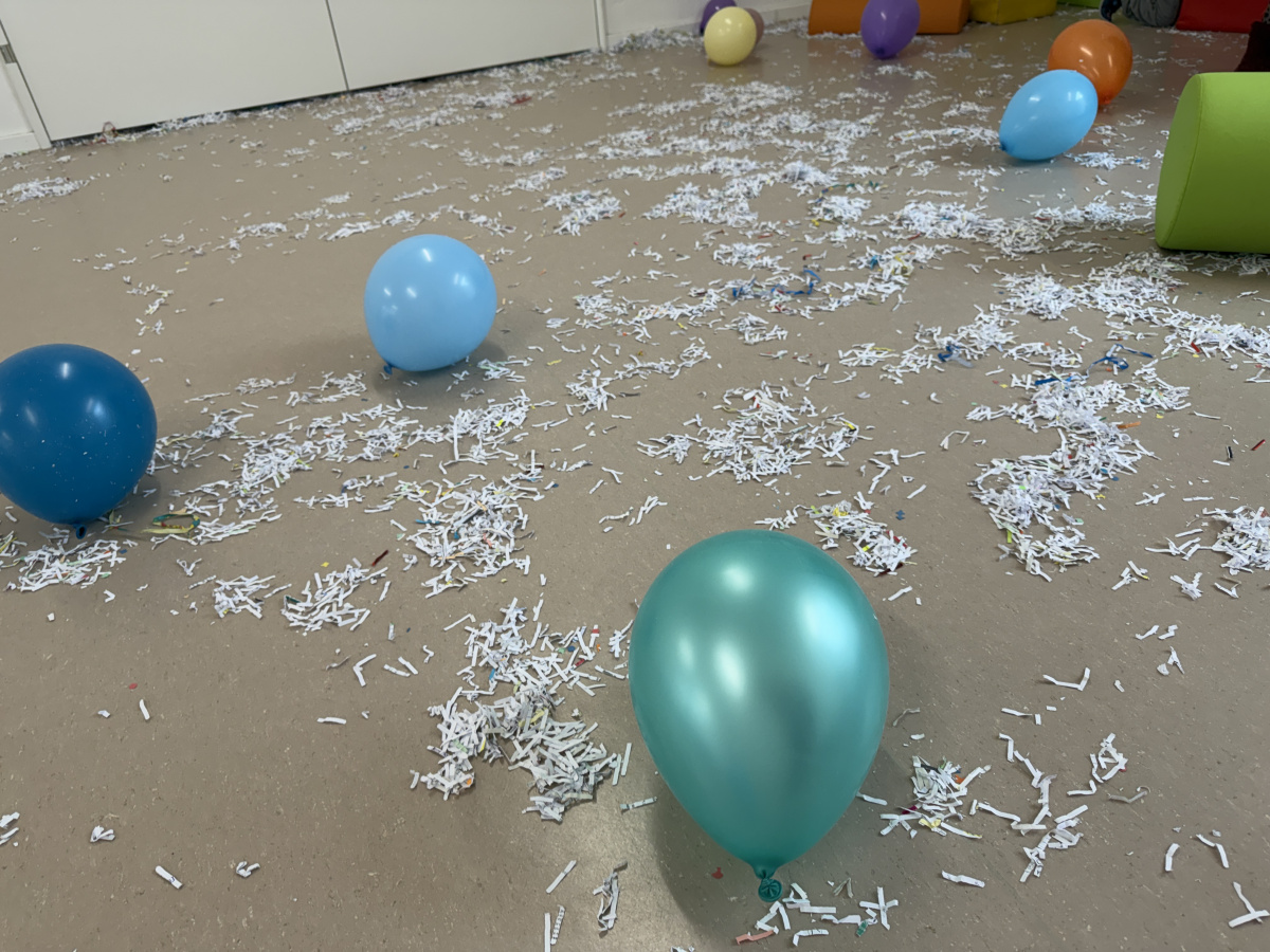 Im Turnraum ging es dann richtig rund: Bei einer wilden Party mit Luftballons, Luftschlangen und vielen Papierschnipseln wurde ausgelassen gefeiert. Es wurde getanzt, gelacht, eine fröhliche Polonaise gemacht und natürlich durften auch lustige „Konfetti-Schlachten“ nicht fehlen.